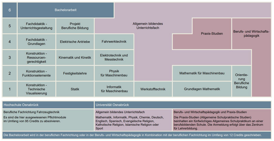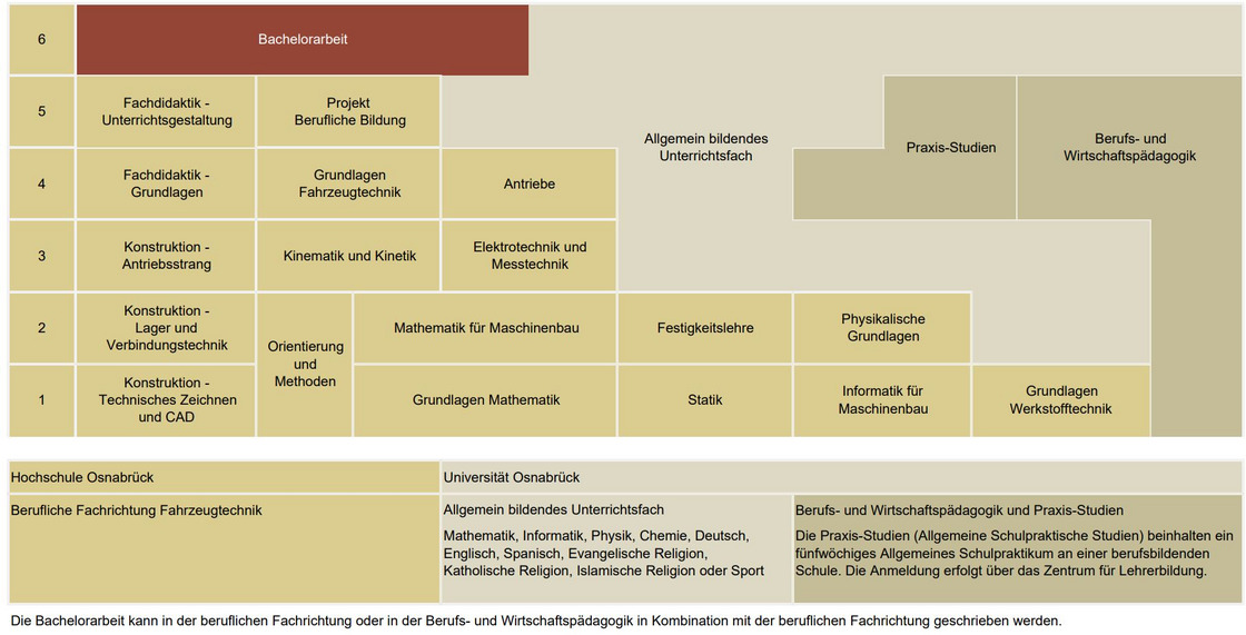 Die inhaltliche und zeitliche Gewichtung der drei Studienschwerpunkte verlagert sich im Verlauf des sechssemestrigen Studiums. Im ersten und zweiten Semester liegen der inhaltliche und zeitliche Schwerpunkt des Studiums im Bereich der beruflichen Fachrichtung Fahrzeugtechnik und damit an der Hochschule Osnabrück.