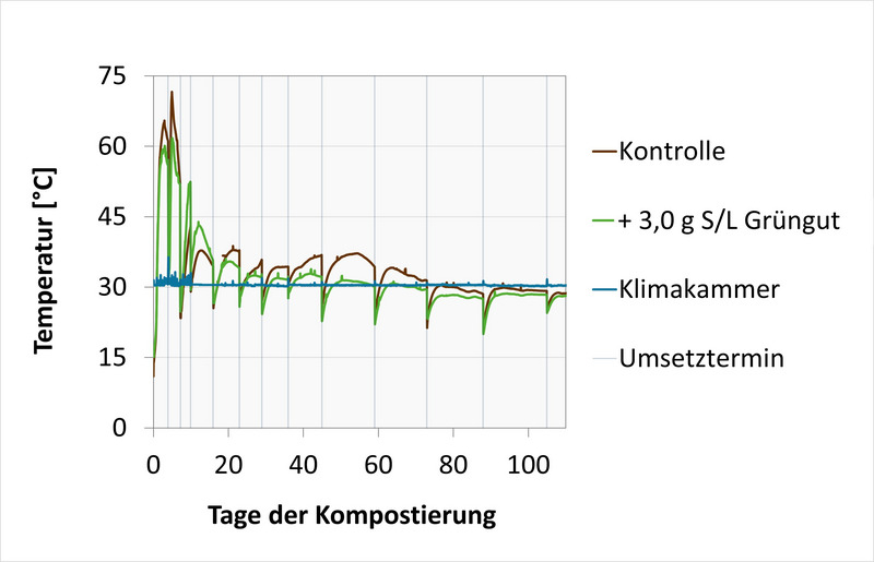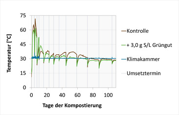 Ein Teilerfolg: In dem modifizierten Reaktorsystem konnte über kurze Zeit eine Kompost-Temperatur von 59,7 °C generiert werden! Mithilfe einer kontstant eingestellten Raumtemperatur und einer zusätzlichen Isolation der Reaktoren erreichte der Grüngutkompost während der Intensivrotte zumindest annähernd die praxisübliche Zieltemperatur von 60 - 65 °C. Da das System allerdings nur in einer Klimazelle funktioniert, können an der Hochschule maximal 6 Reaktoren gleichzeitig zum Einsatz kommen. In dem Umfang können zwar mit wenigen Varianten Gasmessungen vorgenommen werden, um jedoch den Einfluss von Additiven auf den Kompostierungsprozess mit einer repräsentativen Anzahl an Wiederholungen testen zu können, muss noch ein anderes System entwickelt werden.