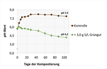 Ein wichtiger Faktor, der den Einsatz von Grüngutkomposten in Kultursubstraten begrenzt, ist der pH-Wert. Dieser liegt in der Regel bei über 7,0 und ist damit besonders in stark torfreduzierten bzw. torffreien Substratmischungen zu hoch.