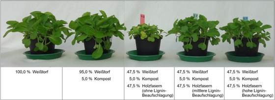 Um dies zu prüfen wurden zwei Kressetests angelegt. Dieses Testverfahren wird in Weckgläsern durchgeführt. Diese Vorgehensweise hat den Vorteil, dass die Ursachen für etwaige Pflanzenschäden besser eingegrenzt werden können. Ein Teil der Kressesamen wird dabei direkt auf das Substrat (unten im Glas) und der andere Teil auf einem Wattepad ohne Kontakt zum Substrat (oben im Glas) ausgesät. Eine gehemmte Keimung nur auf dem Substrat und nicht auf dem Wattepad würde z. B. für eine zu hohe Konzentration bestimmter Salze oder organischer Hemmstoffe in der Bodenlösung sprechen. Eine Beeinträchtigung der Kresse im unten und oberen Teil würde hingegen für eine Freisetzung gasförmiger Pflanzenschadstoffe sprechen. Tatsächlich zeigten sich keine wesentlichen Unterschiede zwischen den Kontrollvarianten und den Substraten, denen 47,5 Vol.-% der mit Lignin behandelten Holzfaser beigemischt wurden.