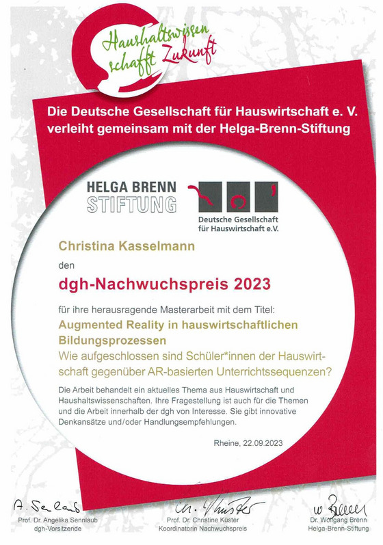 Die Abschlussarbeit von Christina Kasselmann trägt den Titel „Augmented Reality in hauswirtschaftlichen Bildungsprozessen: Wie aufgeschlossen sind Schüler*innen der Hauswirtschaft gegenüber AR-basierten Unterrichtssequenzen?“.