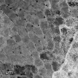ODS-Materialien bieten Vorteile für die Prozessindustrie, zum Beispiel in Form von optimierten Bauteilen wie Gasbrennerköpfen oder Wärmetauschern, die aggressiven Umgebungen standhalten. Eine Abbildung zeigt die Mikrostruktur eines solchen Bauteils, bei dem die Standardlegierung mit Yttrium-Oxid (schwarze Punkte) modifiziert wurde, was den Verfestigungseffekt bewirkt.