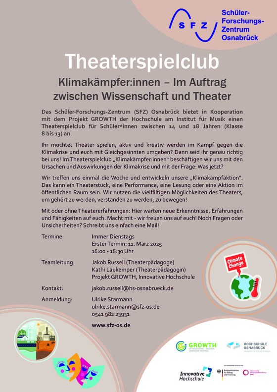 Außerdem könnt ihr euch ab jetzt beim Schüler-Forschungs-Zentrum Osnabrück für unseren Theaterspielclub anmelden!