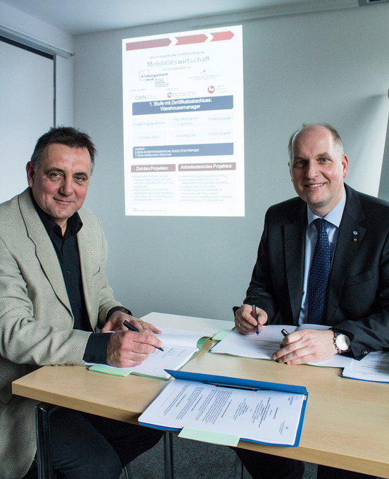 Der Zertifikatslehrgang „Warehouse-Manager“ startet im Mai 2014 als Pilotprojekt des Bildungswerk ver.di in Niedersachsen e.V. in Kooperation mit der Hochschule Osnabrück. Er ist Bestandteil im Förderprogramm „Offene Hochschule, Schwerpunkt Mobilitätswirtschaft“ des Landes Niedersachsen und unterstreicht die Bedeutung der Thematik im Land. Wolfgang Scheda, Regionalleiter des Bildungswerk ver.di in Niedersachsen e.V, und Hochschul-Vizepräsident Prof. Dr. Frank Blümel unterzeichneten die Vereinbarung zum Start dieses Angebots im Themenfeld „Offene Hochschule“.