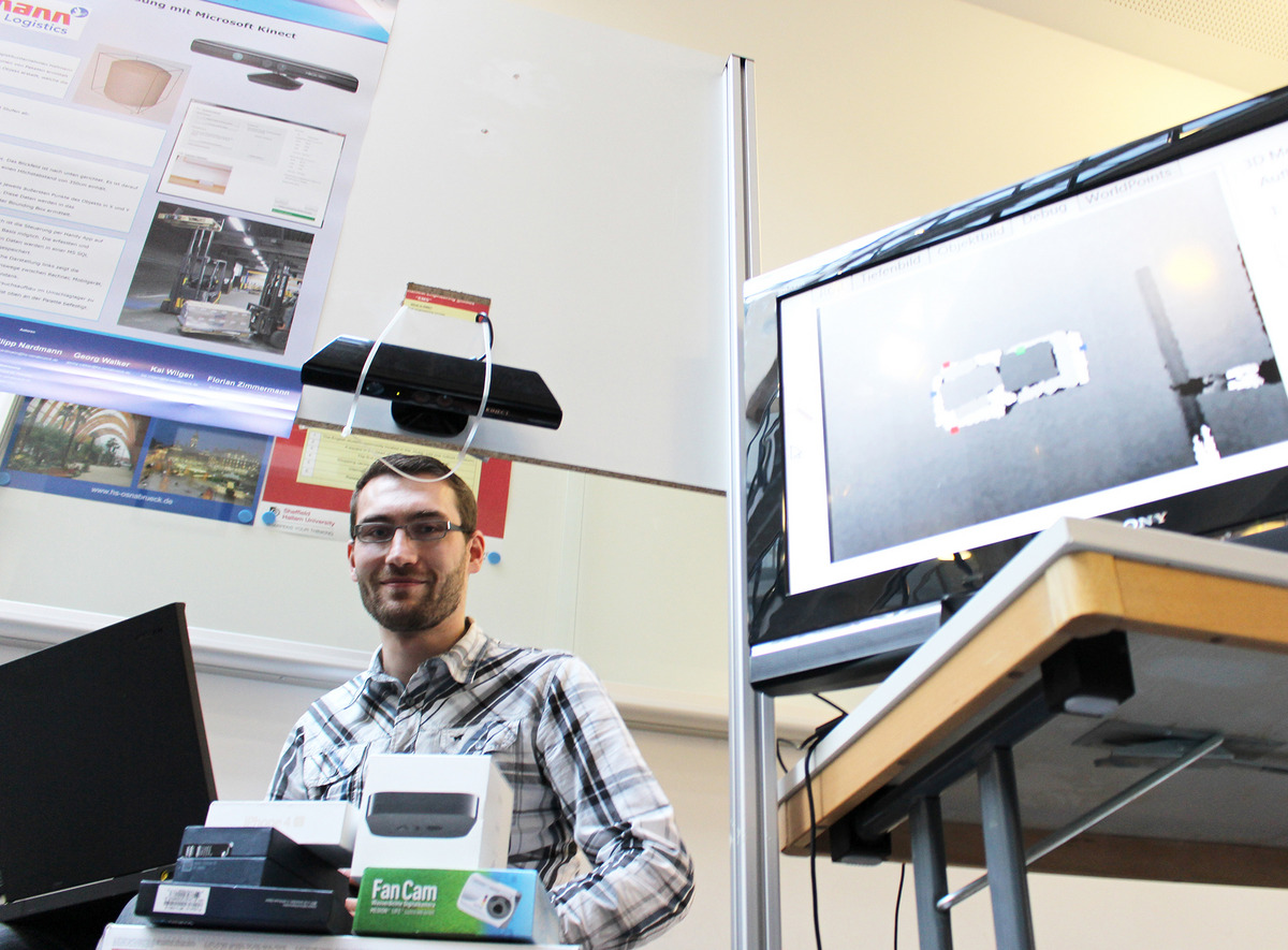 Das Team um Philipp Nardmann stellte auf der Projektmesse ein Programm vor, welches Pakete auf einem Umschlagslager über eine Infrarot-Kamera vermisst. Die Aufgabe kam vom Osnabrücker Logistik-Unternehmen Hellmann Worldwide Logistics. „ Bisher wurden Transporte häufig über das Gewicht der Sendung abgerechnet. Bei einer verbrauchsgerechten Abrechnung spielt das Sendungsvolumen als Kostenfaktor eine mindestens genauso wichtige Rolle“, erklärt Peter Schenk, IT-Bereichsleiter bei Hellmann. Und bislang vermessen Lagermitarbeiter die Packstücke ganz traditionell mit Zollstöcken. „Es gibt zwar Standard-Lösungen auf dem Markt, die die Paketgröße mit Infrarot-Lasern bestimmen – bislang sind solche Vermessungsplätze jedoch sehr teuer.“ So entstand die Idee einer Packstückvermessung mit dem aus Videospielen bekannten Kinect-Sensor der Firma Microsoft – diese Idee hat nun das Team um Philipp Nardmann unter der Leitung des Dozenten Björn Plutka umgesetzt. „Wir haben uns wöchentlich getroffen und rund 200 Arbeitsstunden pro Person ins Projekt investiert“, sagt der Informatik-Student. Nach den ersten erfolgreichen Tests an der Hochschule hat das Team seine Lösung im Umschlaglager von Hellmann präsentiert. Schenk und sein Kollege Michael Dopp sind mit den Ergebnissen der Studienarbeit zufrieden: „Das Projekt hat nachgewiesen, dass der Sensor generell für die Problemstellung geeignet ist. Im Rahmen des Tests am Lager haben wir noch Limitierungen festgestellt, die für eine Produktionslösung adressiert werden müssen. Wir wollen den erarbeiteten Ansatz weiterverfolgen, um in Zukunft genauere und zuverlässigere Messergebnisse zu erzielen – vielleicht auch im Rahmen von Abschlussarbeiten.“