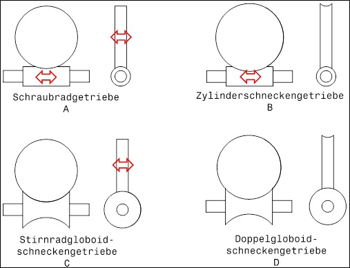 Schneckengetriebe mit einem Achskreuzungswinkel von 90° unterscheiden sich durch die Form von Schnecke und Schneckenrad. Diese kann zylindrisch oder globoidisch sein. Somit ergeben sich 4 Alternativen, die im Bild dargestellt sind. Dabei symbolisieren die roten Pfeile eine Verschiebbarkeit in Achsrichtung.