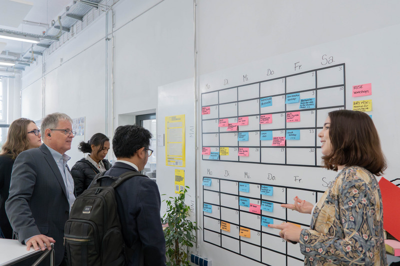 Im Zentrum des Besuchs stand die Frage, wie unternehmerisches Denken und Handeln an der Hochschule Osnabrück sowohl in der Lehre als auch außerhalb des regulären Curriculums gefördert wird. Jana von Höne, Co-Teamleitung des RISE, gab in einer Präsentation einen umfassenden Einblick in die vielfältigen Aktivitäten des StartUp!Labs. Im Anschluss daran übernahm Martin Mertes, Co-Teamleitung des Make! Labs, die Führung durch den Werkstattbereich und bot den internationalen Gästen einen direkten Blick hinter die Kulissen.