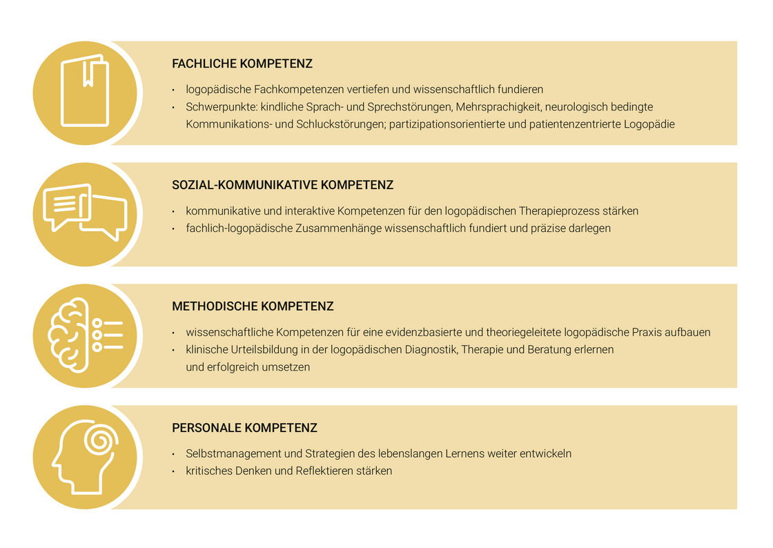 Als Bachelorstudiengang, der auf eine abgeschlossene Ausbildung als Logopäd*in aufbaut, steht für uns besonders die Vermittlung wissenschaftlicher Schlüsselkompetenzen für die Arbeit mit Patient*innen im Mittelpunkt. Unsere Studierenden lernen, sich aktiv mit wissenschaftlichen Erkenntnissen und Ansätzen für die Diagnostik und Therapie auseinander zu setzen. Sie lernen sich aktuelles Wissen anzueignen und den Einsatz dieses Wissens in der Praxis zu reflektieren. Die kritische Reflexion des eigenen therapeutischen Handels in der Diagnostik, Therapie und partizipativen Gestaltung einer logopädischen Intervention ist eine zentrale Kompetenz, die der Studiengang vermittelt. Besonders wichtig ist uns, unsere Studierenden in einer intensiven Auseinandersetzung mit eigenen Fragestellungen und Interessen zu stärken und zu unterstützen.