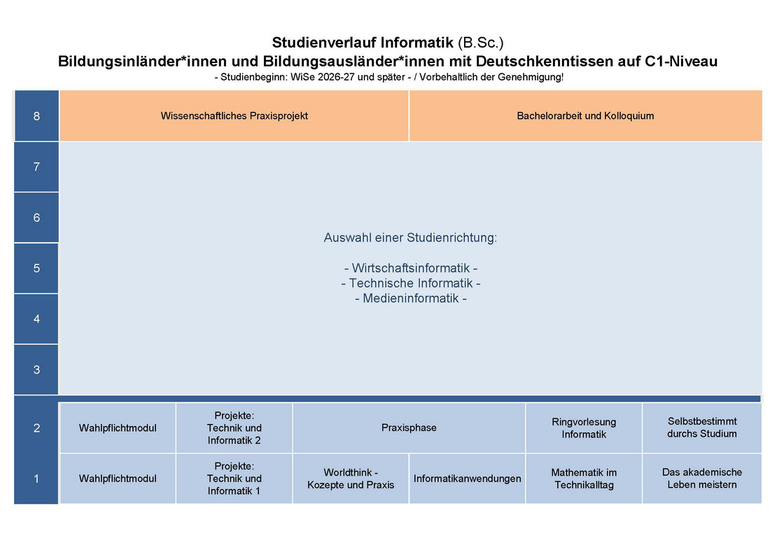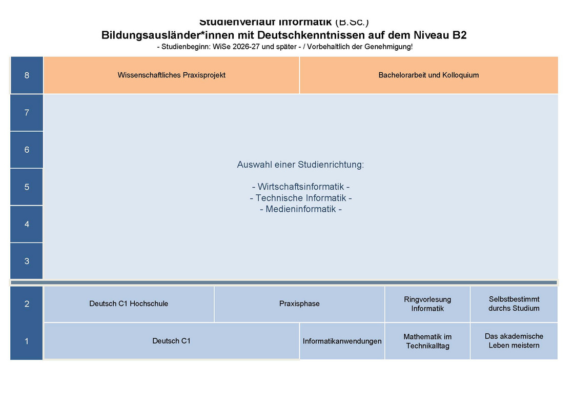 Die Regelstudienzeit des modular aufgebauten Bachelorstudiengangs Informatik beträgt acht Semester.