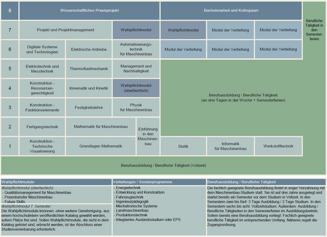 Die Regelstudienzeit des Bachelorstudiengangs Maschinenbau im Praxisverbund (MPV) beträgt acht Semester. Die Gesamtdauer des Ausbildungsganges beträgt - mit einer integrierten dreijährigen Berufsausbildung - in der Regel viereinhalb Jahre.