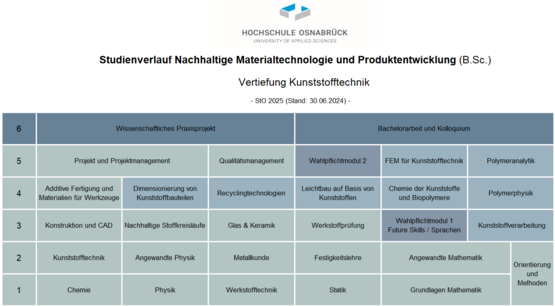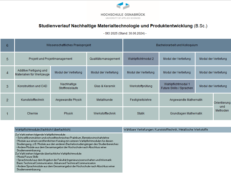 Die Regelstudienzeit des modular aufgebauten Bachelorstudiengangs "Nachhaltige Materialtechnologie und Produktentwicklung" beträgt sechs Semester mit insgesamt 180 ECTS-Punkten.