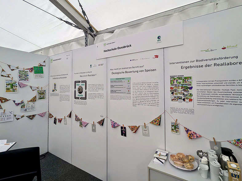 Dort konnten die Besucher*innen Einblicke in die Forschungsarbeiten gewinnen und mehr über den Zusammenhang zwischen Biodiversität und Ernährung erfahren. Ein Highlight des Standes war die Ausstellung der erarbeiteten Kommunikationsmaterialien, bestehend aus Tischsets, Flyern, Comics sowie Postern. Diese Materialien wurden während des Projektes in Großküchen eingesetzt, um Gäste für die Wahl eines biodiversitätsfreundlichen Menüs zu motivieren.