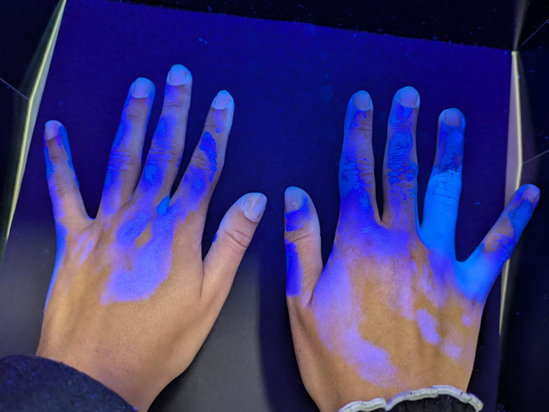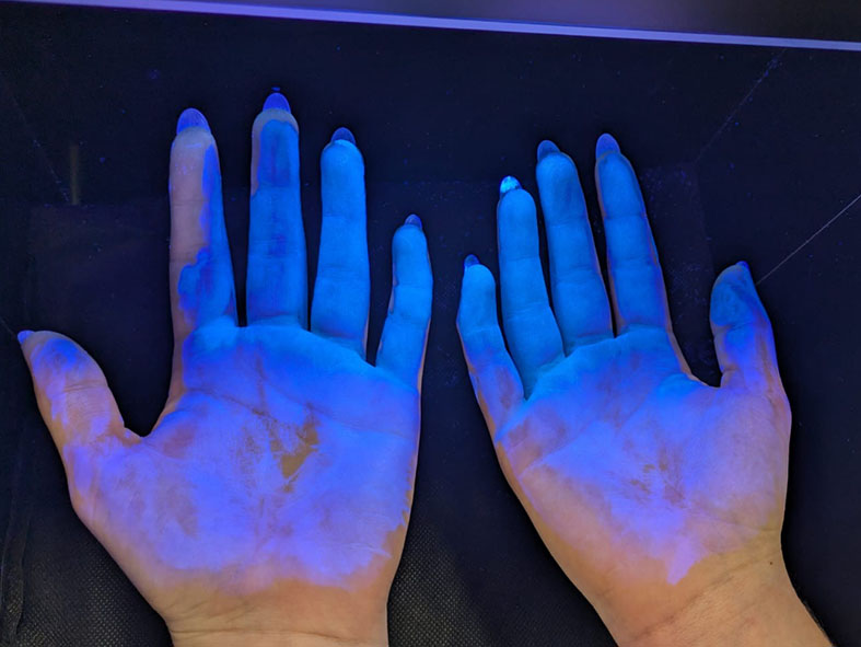 Die Studierenden "wuschen" sich ihre Hände mit einem speziellen fluoreszierenden Kontrastmittel. Anschließend hielten sie ihre Hände in eine Blackbox, in der UV-Schwarzlicht installiert war. In diesem Licht leuchten alle von dem Kontrastmittel benetzten Hautstellen intensiv blau. Dies ermöglicht eine sofortige Sichtbarmachung von Benetzungslücken. Anschließend wuschen sich alle sehr gründlich die Hände mit Seife. Wieder wurden die Hände in die Blackbox gehalten. Die Stellen, an denen das Kontrastmittel trotz Händewaschen noch anhaftete, leuchteten wieder intensiv blau. Dieses Bild entsteht bei einer unzureichenden Handhygiene. Denn nach richtigem und gründlichem Händewaschen leuchten die Hände überhaupt nicht.
