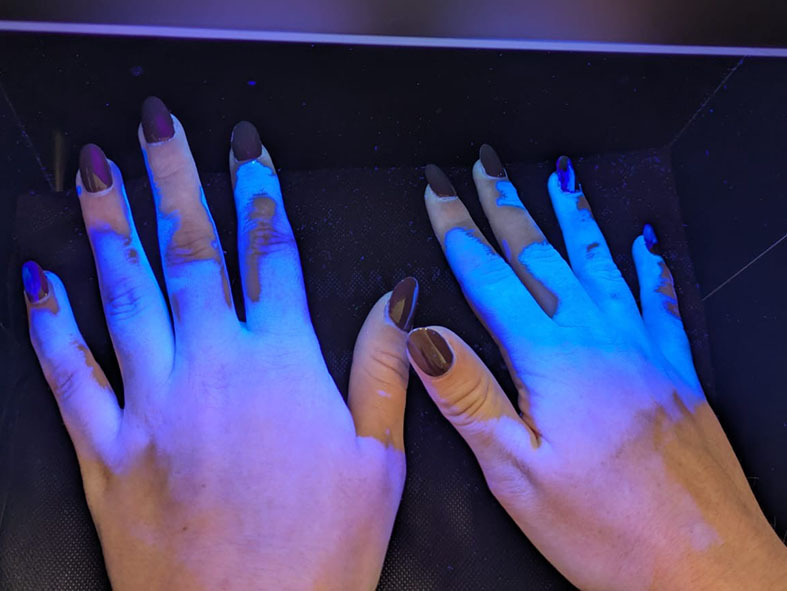 Diese Methode ist ein bewährtes Mittel für Hygieneschulungen oder Hygienekontrollen, um Lücken in den Hygienepraktiken aufzudecken, zu beseitigen und das Bewusstseins für die Handhygiene zu fördern.