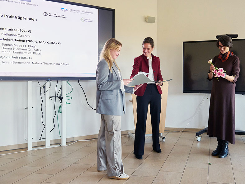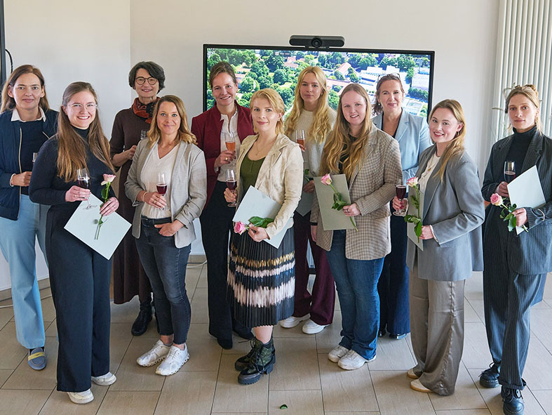 Herausragende Studienleistungen mit Ideen, Konzepten und Forschung, die zu einer fairen Ernährungsumgebung beitragen können, werden seit 2004 von der Rut- und Klaus-Bahlsen-Stiftung mit einem Preisgeld von insgesamt 2500 € einmal jährlich prämiert. Am 6. November 2025 war es so weit und 7 Preisträgerinnen aus den Studiengängen „Angewandte Nutztier- und Pflanzenwissenschaften“, „Landschaftsentwicklung“ und „Ökotrophologie“ wurden für ihre jeweilige Studienarbeit im WABE-Zentrum mit dem Klaus Bahlsen Preis 2025 ausgezeichnet. Dr. Sabine Schopp, geschäftsführendes Vorstandsmitglied der Stiftung ist begeistert: „Unsere Stifter hätten ihre große Freude daran, wenn sie sehen könnten, wie umfassend, professionell und vielseitig ihre Gedanken über ökologischen Landbau und gesunde Ernährung im WABE-Zentrum bei den Studierenden umgesetzt werden.“