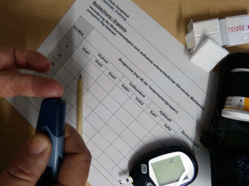 Wie schnell steigt der Blutzuckerspiegel eigentlich nach dem Verzehr von Vollkornbrot, Traubenzucker oder Saft an? Ist Traubenzucker am schnellsten im Blut? Was passiert mit dem Blutzuckerspiegel nach einer Stunde? Diesen und anderen Fragen sind Studierende in der Versuchsreihe "Wirkung von Lebensmitteln auf den Blutzuckerspiegel" nachgegangen. Im Eigenversuch haben die Studierenden getestet und dokumentiert, wie sich der Blutzuckerspiegel nach dem Verzehr von Vollkornbrot, Traubenzucker oder Saft innerhalb einer Stunde verhält. Beim ersten Pikser gab es noch Murren, später war die Blutabnahme dann Routine. Ein spannender Versuch!
