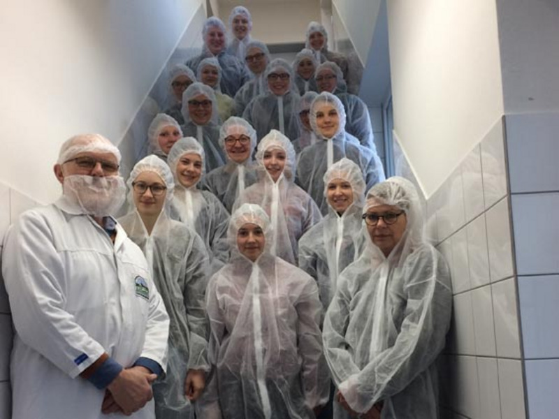 Der Eichenhof-Schlachthof in Georgsmarienhütte war Ziel einer Exkursion von Studierenden im Modul Hygiene der Lebensmittel. Der Schlachthof ist Teil einer geschlossenen Erzeugerkette (vom Ferkel bis zum Schnitzel). Nach einer Hygienebelehrung und Ausstattung mit Schutzkleidung ging es in Kleingruppen durch den Schlachtbetrieb. Im laufenden Betrieb konnten die Studierenden von der Anlieferung der lebenden Schweine bis zur Zerlegung der Schlachtkörper in gewünschte Teilstücke interessante Eindrücke gewinnen.