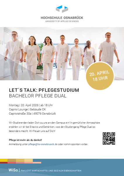Wir Studierenden laden Dich am 07. April um 18 Uhr zu uns an den Campus in die Caprivi Lounge ein, um dir in gemütlicher Atmosphäre bei Snacks und Getränken zu erzählen, was den Studiengang Pflege Dual so besonders macht. Melde dich gern unter pflege@hs-osnabrueck.de an oder komm spontan vorbei. Wir freuen uns auf Dich!