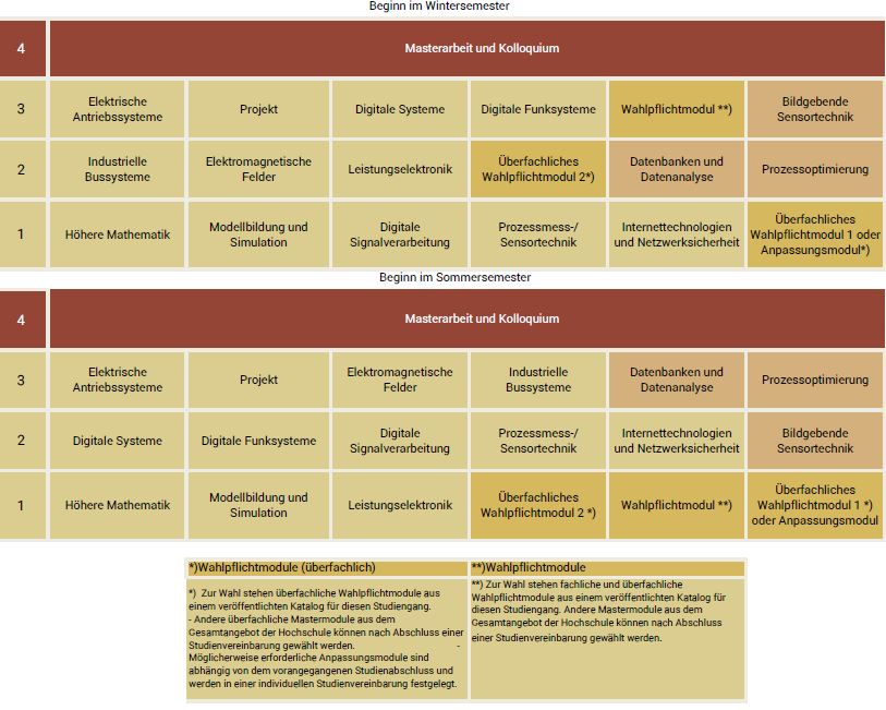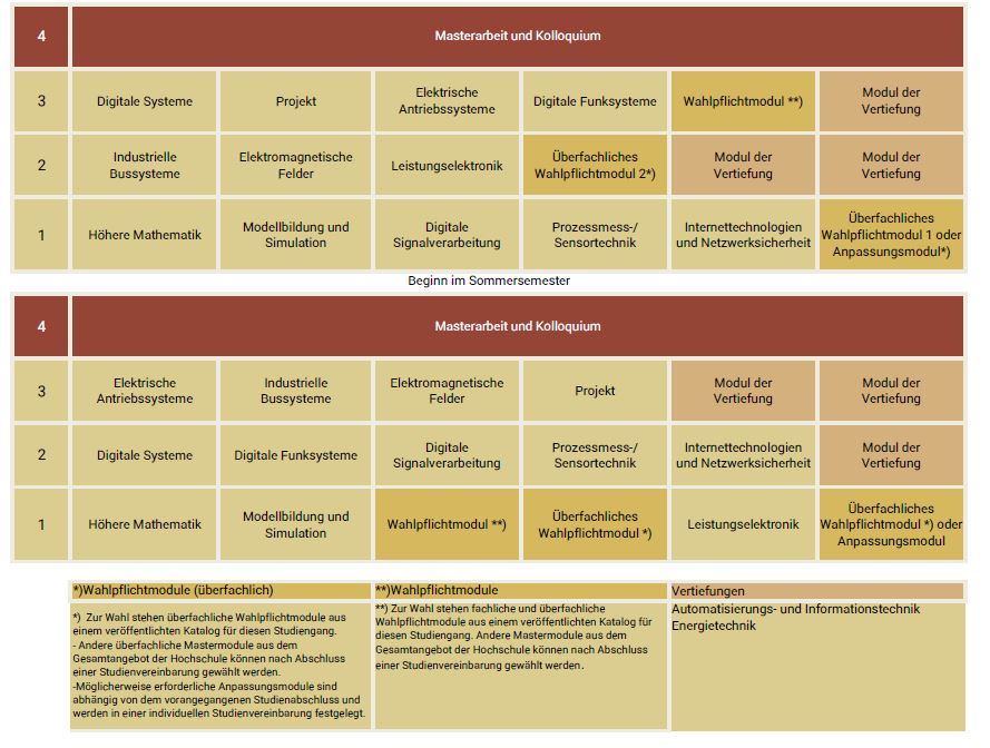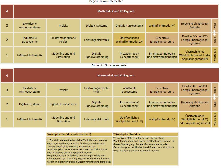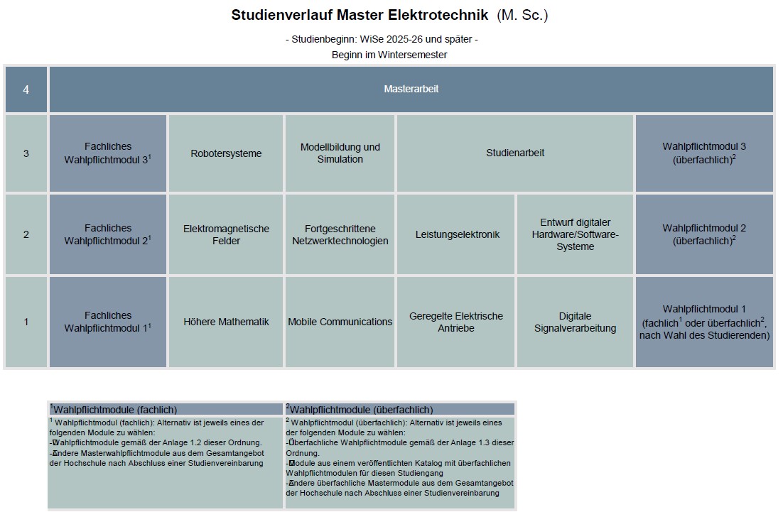 Der Masterstudiengang "Elektrotechnik" wurde einem Akkreditierungsverfahren unterzogen. Daher gestaltet sich der Studienverlauf für Studierende mit Studienbeginn Wintersemester 2025/26 und später geringfügig abweichend vom Studienverlauf Studienbeginn Sommersemester 2025 und früher.