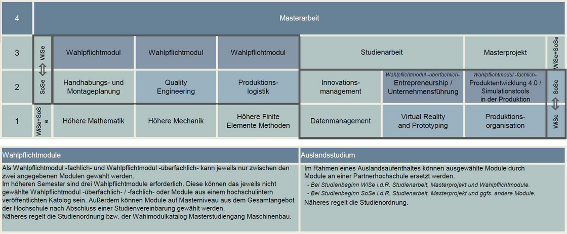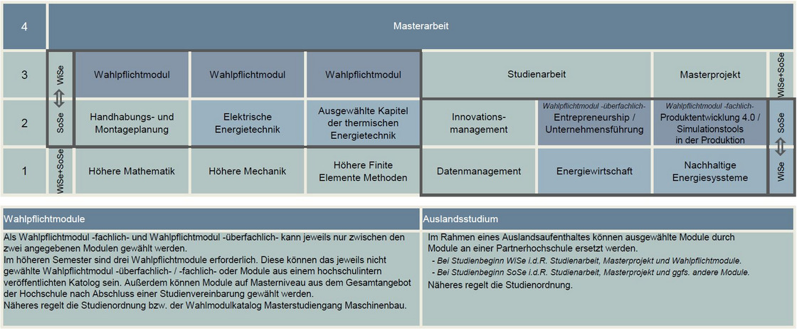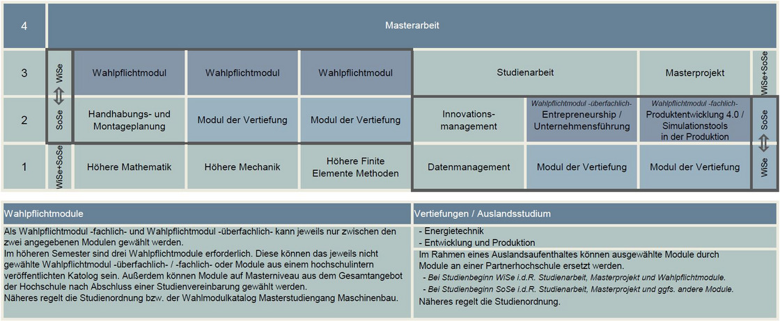 Der Masterstudiengang Maschinenbau (M.Sc.) ist auf eine Regelstudienzeit von vier Semestern mit 120 Leistungspunkten ausgelegt. Er umfasst drei Theoriesemester mit jeweils 30 Leistungspunkten und schließt im vierten Semester mit der Masterarbeit (ebenfalls 30 Leistungspunkte) ab.