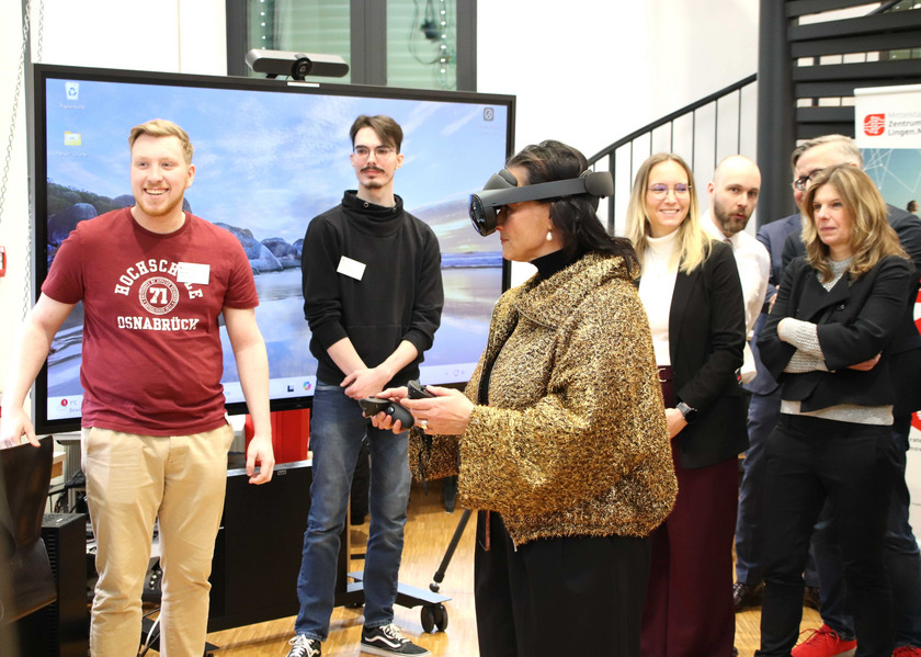 Im modernen Laborgebäude des Campus Lingen standen anschließend erlebbare Beispiele und Lerntechniken für KMU im Mittelpunkt. Dazu gehörten Technologien wie Drohnen, 3D-Scanner, Virtual Reality, Künstliche Intelligenz und Eye-Tracking. Connemann probierte selbst eine Supermarktanwendung mit Eye-Tracking aus, indem sie eine VR-Brille aufsetzte und sich in einer Virtual-Reality-Szenerie bewegte. Auch ein Drohnenflug in virtueller Umgebung wurde demonstriert. Die Beispiele zeigten anschaulich, wie digitale Technologien für Qualifizierung, Prozessoptimierung und Innovation im Mittelstand genutzt werden können.