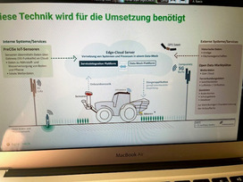 Dr. Henning Müller gab in seinem Vortrag Einblicke in Anwendungsgebiete von KI in der Landwirtschaft und stellte verschiedene Projekte vor, in denen KI-basierte Technologie auf dem Feld und im Stall zur Anwendung gekommen sind.
